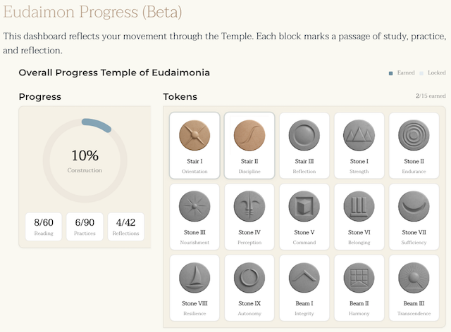 after which a virtue token is conferred. You can track your movement through the Temple at all time in the Eudaimon Progress dashboard.